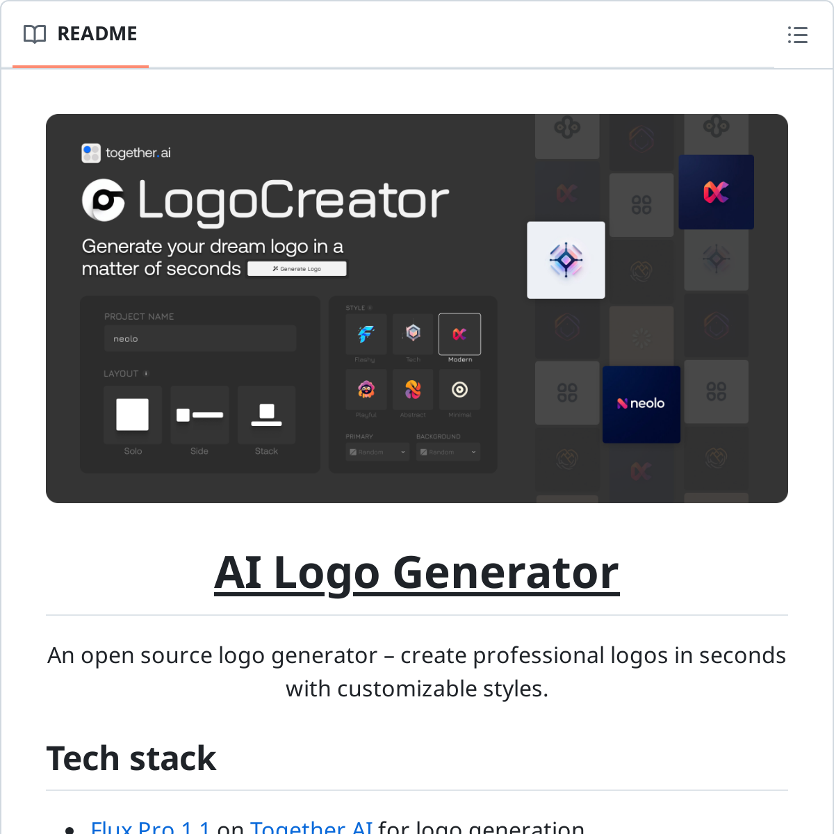 想快速为自己定制一个专属 Logo 吗?Logocreator 帮你搞定!它是一个免费且开源的 Logo 生成器,基于 Together AI 平台中的 Flux 模型,根据你的需求,快速生成各种风格的 Logo。它本身使用了 Next.js、Shadcn UI 和 Tailwind CSS 等流行的技术栈,方便你进行二次开发和定制。如果你想自己部署,也很简单,只需要克隆代码,配置 Together AI 的 API 密钥就可以跑起来了。