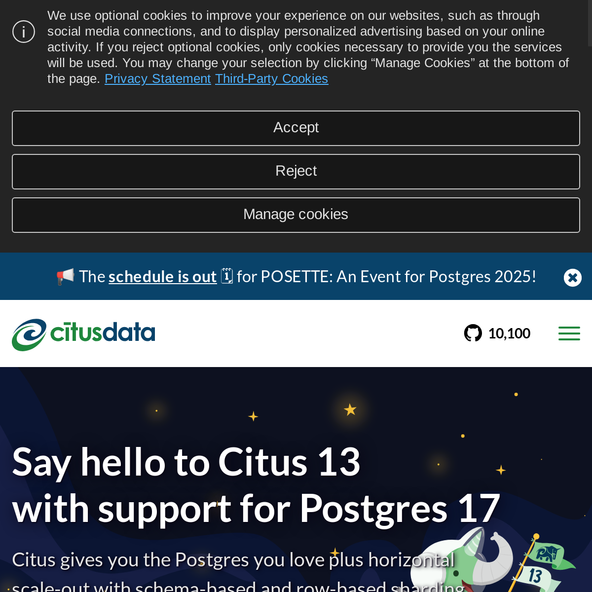 Citus Data 以扩展插件的形式为 Postgres 提供分布式能力,让你可以在水平方向上轻松扩展数据库。它通过 schema 和 row-based sharding 技术实现,并且代码完全开源。Citus 与社区合作紧密,目前已经支持最新的 Postgres 17 版本。你可以从小规模的单节点开始,然后根据需要添加节点。Citus 还能显著提升查询性能,通过并行处理将查询速度提高 20 到 300 倍。由于 Citus 是 Postgres 的扩展,你可以继续使用熟悉的 SQL 工具和 Postgres 知识。
