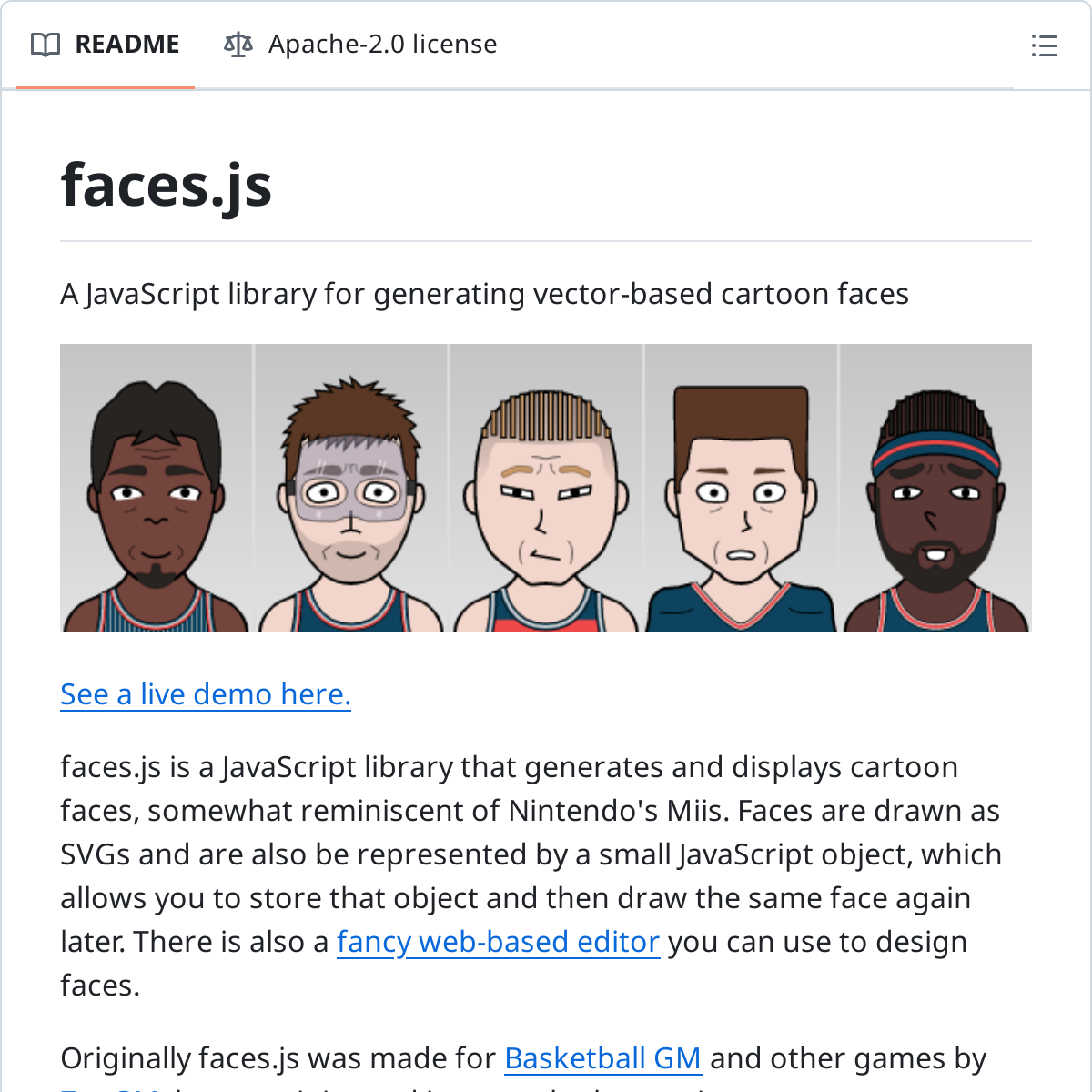 Faces.js 是一个用于生成基于 SVG 的卡通头像的 JS 库。该项目提供了十余处可配置的面部细节,每个细节又有许多选项,能够生成大量不同风格的卡通头像。代码本身的设计也灵活易扩展,可以自行增加 SVG 素材,形成自己项目中专属的头像生成器。Koala 认为:在游戏中为自己角色定制个性化外观是常见的需求,也被称为捏脸。Faces.js 的作者也是在开发篮球经理游戏的过程中设计了这个 JS 库,有同类需求的小伙伴可以尝试使用。