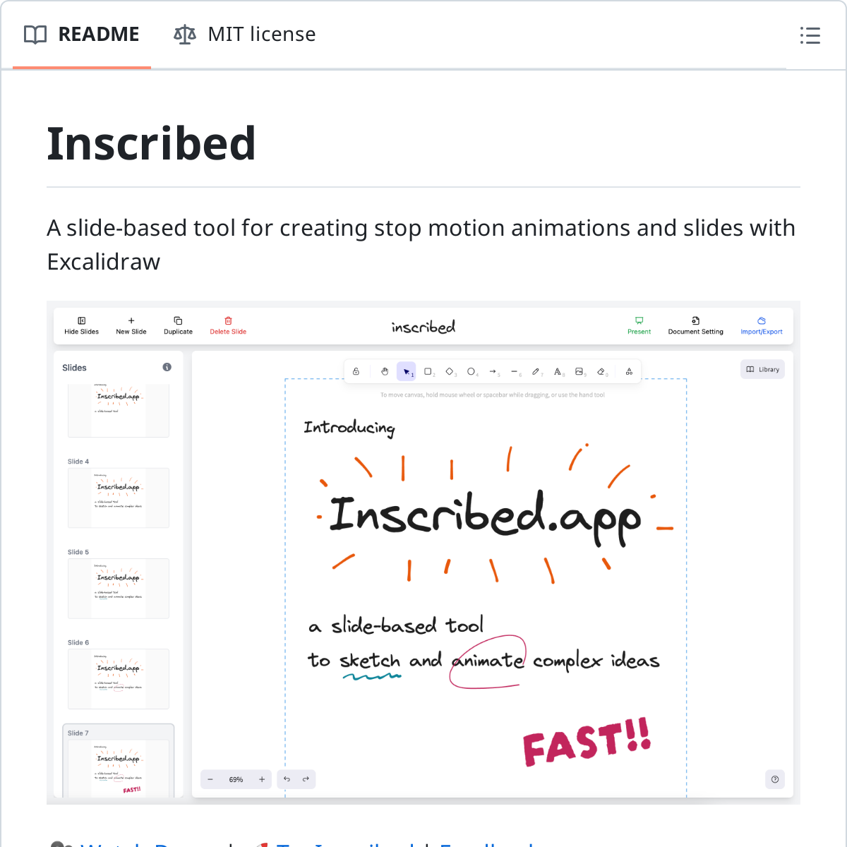 如果你喜欢 Excalidraw 这款白板工具,还经常把它作为 PPT 使用,那你可以试试 Inscribed 这个新工具。它能帮你用熟悉的界面快速绘制草图,制作成多页 PPT,简直是 idea 爆发时的神器。 点评:在 Excalidraw 强大功能的基础上,Inscribed 还设计了更多贴心功能,例如键盘快捷键、自定义画布大小、图片导入、集成 Google Fonts 等。你还可以把你的作品导出为 GIF 动图,或者通过 iframe 嵌入到网页里,方便嵌入到其他网页或发布到社交媒体中。