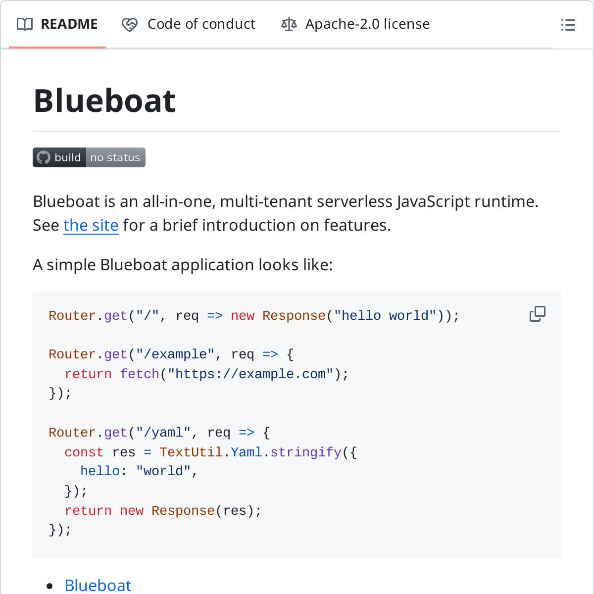 ⾸先分享⼀个叫做 Blueboat 的 serverless 运⾏时,它是基于主流的 JS 引擎 V8 和 Rust 开发的。相⽐其它⼀些 serverless,它更关注 JavaScript 运⾏时的表现,以及它默认提供的⼀个多租户的隔离能⼒。如果你熟悉 Cloudflare Workers 平台,可以将 Blueboat 视为它的潜在的开源替代品。
