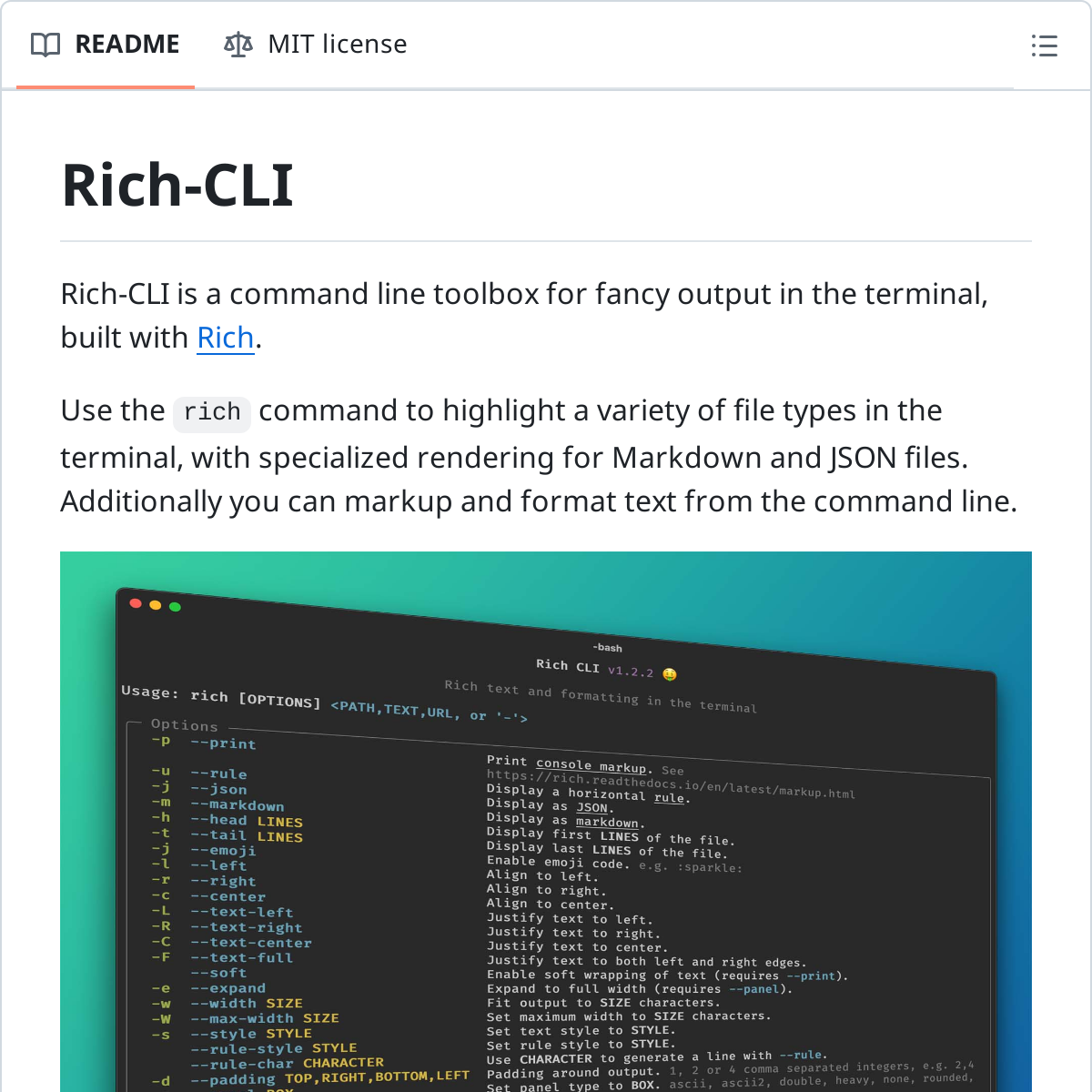 Rich Cli 是⽤ Python 编写的命令⾏⼯具,是基于⼀个使⽤⾮常⼴泛的命令⾏库 Rich 开发的。Rich 可以帮助你在终端上打印各种格式丰富 的内容,⽽ Rich Cli 就是对 Rich功能的进⼀步简化。如果你是命令⾏的重度使⽤者,可以了解⼀下这个⼯具,看是否合⽤。