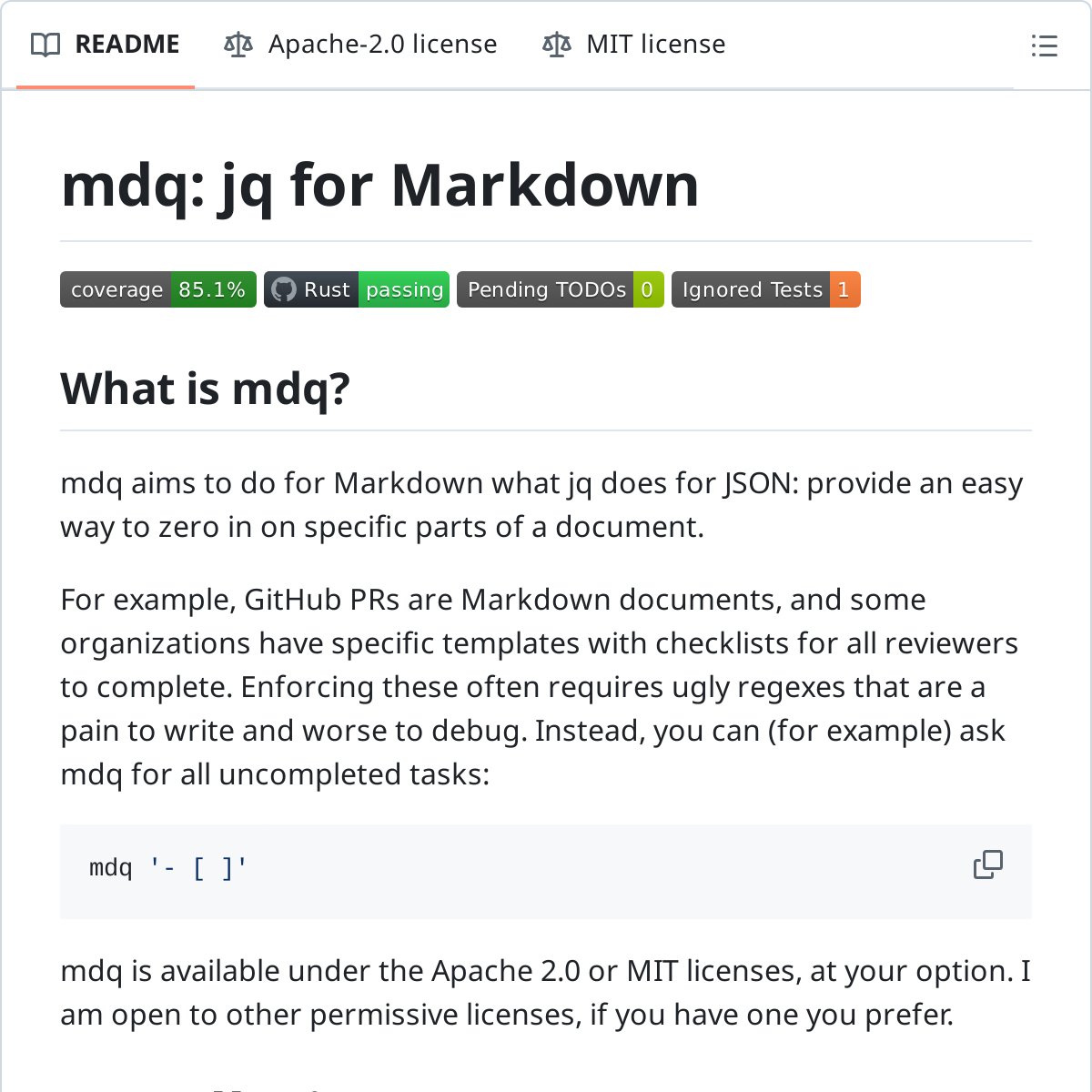 mdq 是一个命令行工具,灵感来源于 JSON 处理工具 jq,但专门用于处理 Markdown 文档。它允许你轻松提取和操作 Markdown 文件中的特定部分,比如标题、列表、链接等。通过简单的语法,你可以快速筛选出需要的内容,比如未完成的任务列表或特定格式的链接。