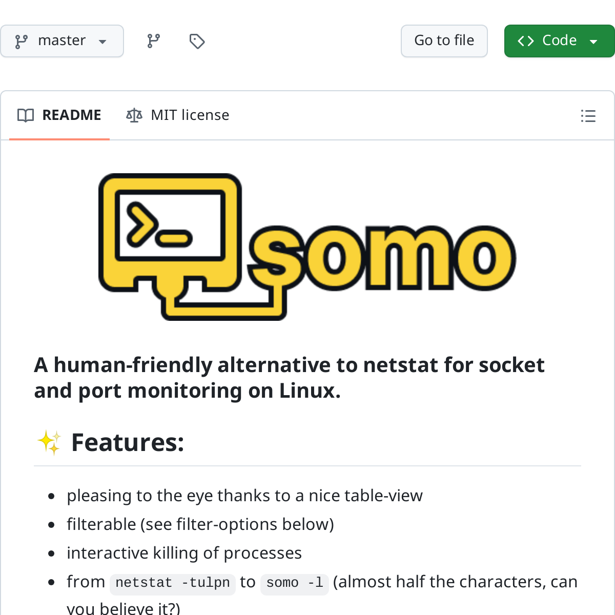 如果你经常使用 netstat,或者需要监控网络状态,那就试试 Somo 吧。它是一个用 Rust 写的命令行工具,可以方便地监控 Linux 上的端口和网络连接。同时它能以更友好的表格形式展示信息,而且支持过滤,你可以根据端口、IP、进程名等条件来查找。Somo 以 TUI 的形式提供交互,在排查问题时保持高效。 特别对于不熟悉 netstat 工具的用户来说,一个像 Somo 这样更加直观易用的工具可以避免在网络异常时还因为工具不顺手而变得更加焦虑。
