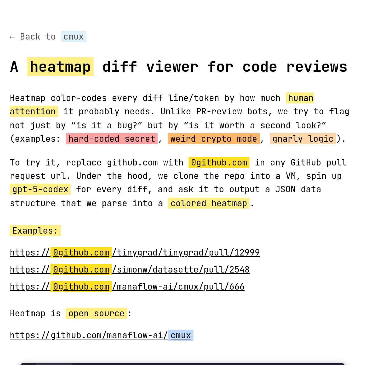 0github 是一个基于 GPT-5-codex 的代码审查工具,使用热力图为每行 diff 标注需要人工关注的程度。不同于传统代码审查机器人只关注 bug,它会标记复杂逻辑等值得二次检查的内容。使用方法很直接,只需在 GitHub 的 PR 链接中把 github.com 替换成 0github.com 即可。