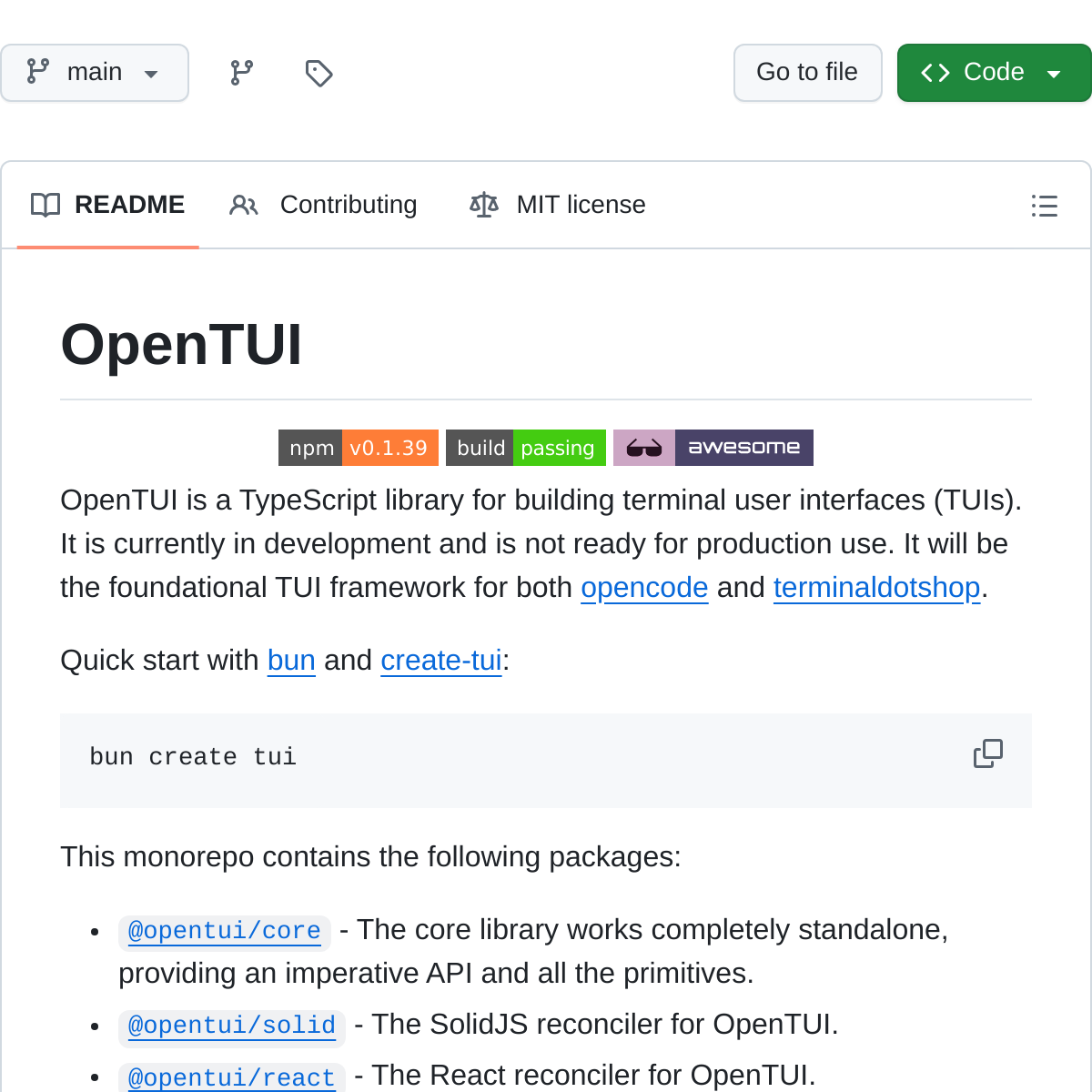 SST 团队正在开发 OpenTUI,一个用 JS 和 TS 构建终端界面的框架。它提供了 React 和 SolidJS 的 reconciler,让前端开发者可以用熟悉的声明式写法来构建 TUI 应用。这个项目将成为 opencode.ai 和 terminal.shop 的基础设施。