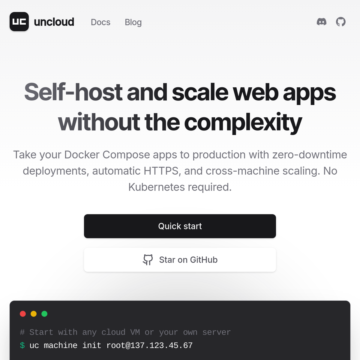 Uncloud 想让部署变简单,又保持生产级能力。它保留 Docker Compose 的开发体验,也实现了几条命令就能零停机部署、自动配HTTPS和多节点部署。核心是有趣的去中心化,没有独立的控制面,而是节点间通过 WireGuard 组网同步状态,形成集群。这种架构在大型集群里的一致性保障和故障排查是否方便,还需要验证。不过对中小型应用,这套方案确实比 K8s 省事多了。