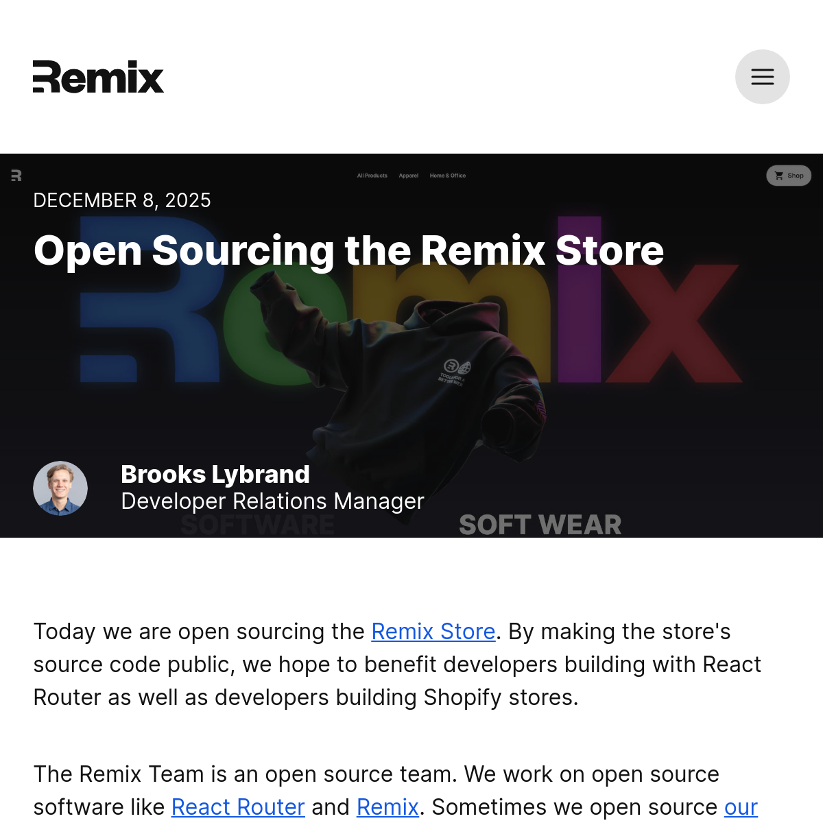 Remix 团队把自家商店代码开源了,这个项目基于 React Router v7 和 Shopify Hydrogen 构建,是个实打实的电商实现。作为一个真实项目,包含了不少打磨过的细节,例如滚动时 3D 卫衣的逐帧动画、爆炸式的标题效果、模糊加载过渡,还有购物车的交互设计。代码里既有优雅实现,也有为了赶进度写的临时方案,完美呈现真实产品开发状态。 点评:这种"不完美但真实"的开源态度值得提倡。对于想在 Remix 框架上构建应用的开发者,这是个不可多得的参考案例。