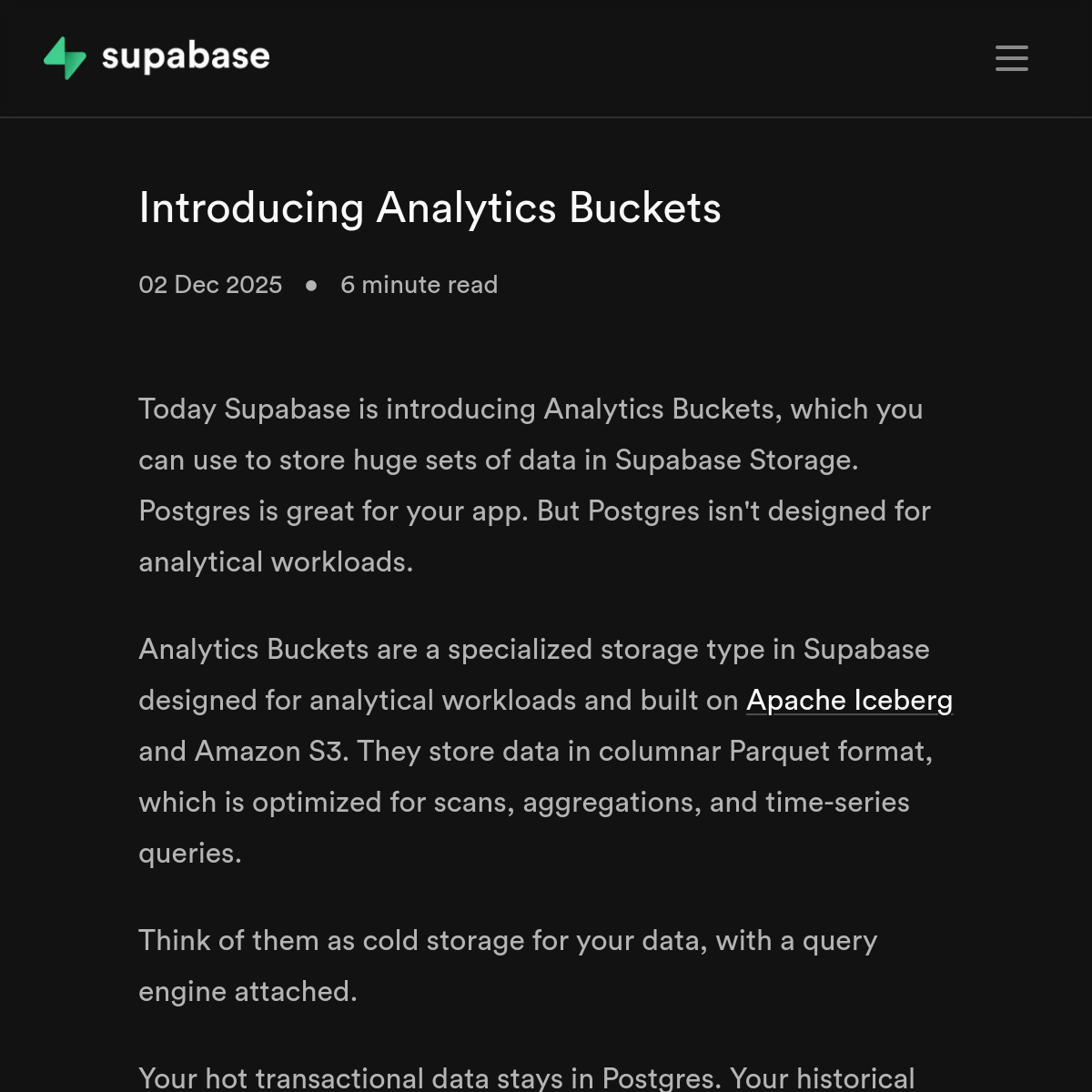 Supabase 推出了 Analytics Buckets 功能,通过基于 Apache Iceberg 和对象存储的专用存储层,让大规模分析和历史数据存储与主 OLTP 数据库分离。这有助于优化数据仓库级分析场景,同时降低事务数据库的压力,并支持与现有分析工具配合使用。官方文档指出这是一个 alpha 特性,仍在迭代中。 点评: 对成长型产品而言,把分析工作负载从核心数据库剥离是一种常见实践,这让 Supabase 不局限于 Postgres 数据库,向数据平台演进上更进了一步。