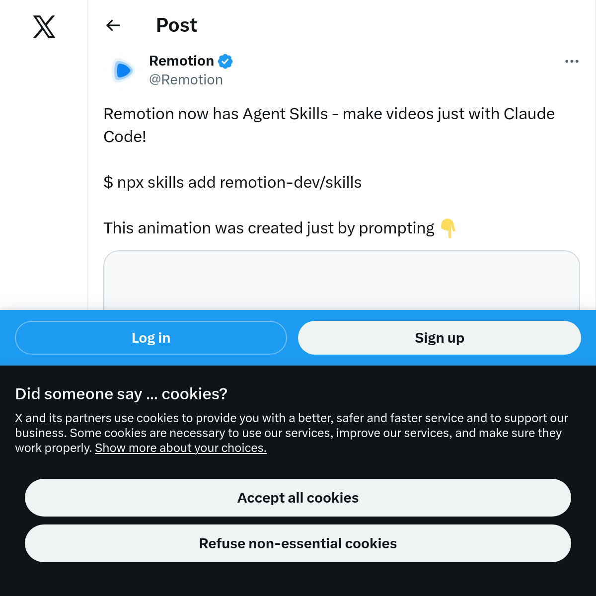 Remotion 一直是用 React 组件做视频的标杆,这次他们发布了专为 AI Agent 优化的 Skills 工具包。开发者可以让 Claude Code 等 agent 用自然语言生成动画代码,不用手写 TypeScript。它还支持 MCP 协议集成,方便嵌入各类 AI 工作流。