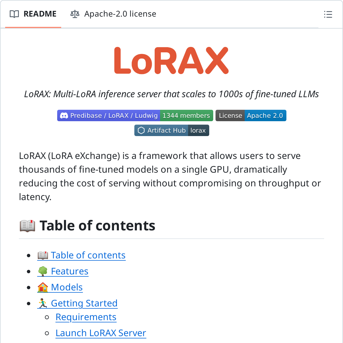 LoRAX 是由 Predibase 开发的 LLM 推理引擎,其特色是可以在单个 GPU 上跑起成千上万个微调过的 LoRA 适配器,大幅降低服务成本,同时不牺牲吞吐量和延迟。它支持动态加载 LoRA 适配器,可以从 HuggingFace、Predibase 或者本地文件系统加载。LoRAX 还支持跨适配器连续批处理,也就是可以将不同适配器的请求打包到同一个批次中,优化推理性能。