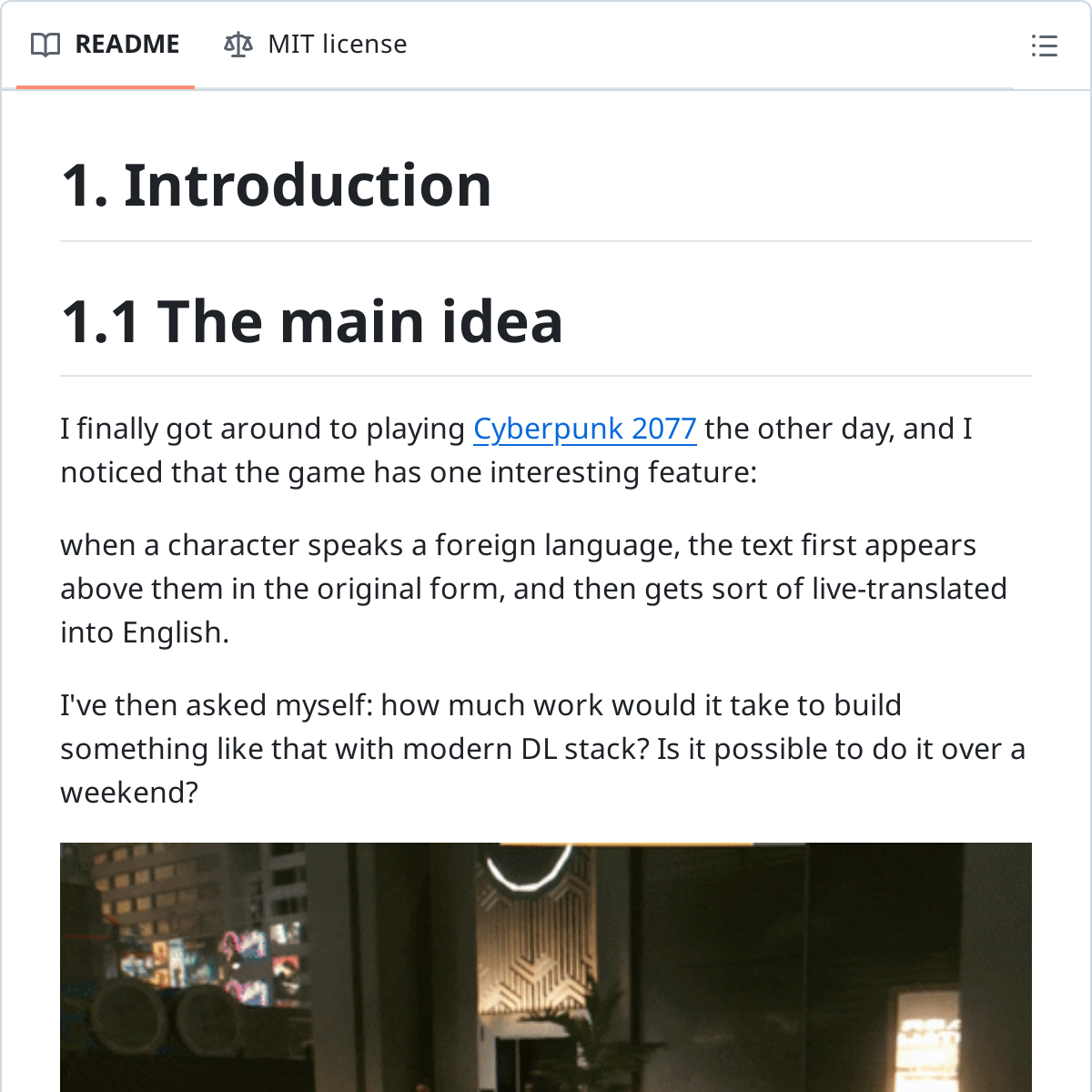 接下来的这位作者、从游戏《赛伯朋克 2077 》中获得了灵感,他在⼀个周末的时间内基于现代的深度学习技术栈开发了⼀个识别程序,能够从视频⽚段中标记出说话的⼈,并实时将所说的内容识别后翻译为其他语⾔。同时,作者还使⽤ Modal ⼯具将这个识别程序、以 serverless 的形式部署⾄云端。从整个 demo 中我们可以看到,社区中的⼯具成熟度⾮常⾼,AI 正变得越来越触⼿可及。