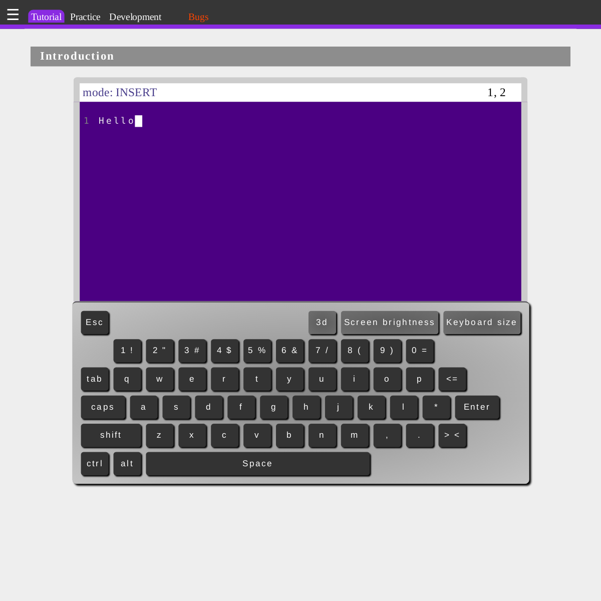 当你熟悉 Vim 的键盘指令后,往往可以获得⾼效的编辑体验,但对初学者来说,Vim ⼜⾮常复杂,不好上⼿。openvim 是⼀个交互式的 Vim 教程,它会介绍 Vim ⾥的基本概念,同时,可以跟随 虚拟键盘 学习 Vim 各种指令的⽤法。