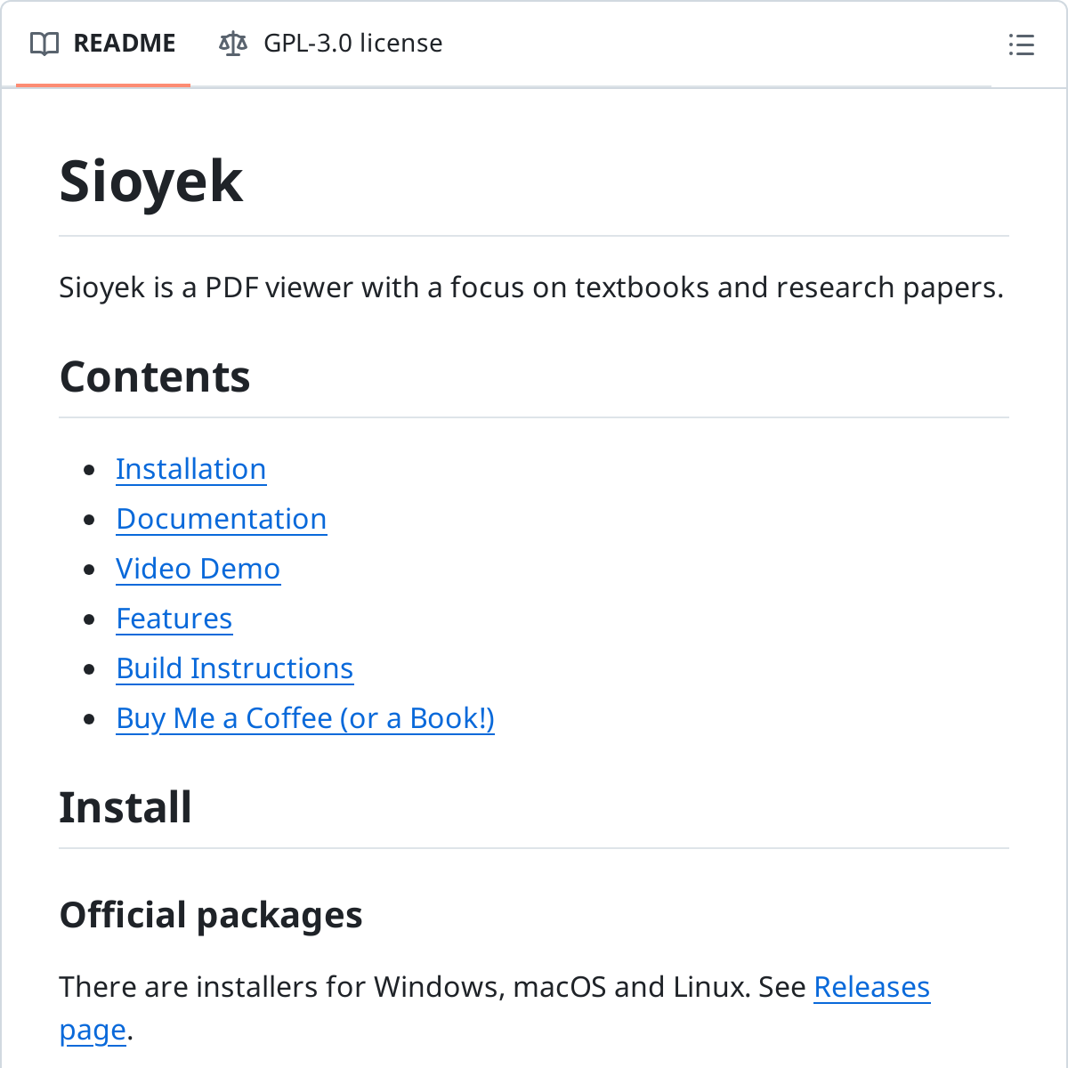 Sioyek 是⼀个 PDF 阅读器,是专为阅读论⽂和技术型书籍⽽设计的。它内置了很多对阅读论⽂⾮常有帮助的功能,例如 更强的⽬录、打开更快、智能跳转等。有论⽂阅读需求的⼩伙伴可以⼀试。