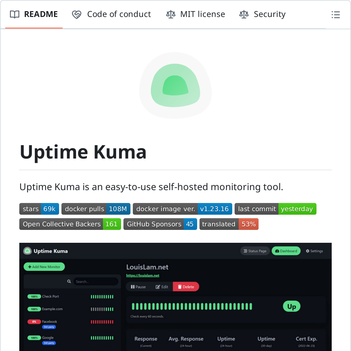 Uptime Kuma 就是⼀个⼩⽽美的⽹站运⾏状态监控⼯具,⽀持通过 Docker 快速部署,通过 Web UI 配置需要监控的⽹站地址与检测间隔等⼀系列配置。当⽹站出现异常时,Uptime Kuma 也⽀持包括邮件、Slack 等在内的90多种通知渠道,使⽹站的拥有者可以第⼀时间进⾏处理。