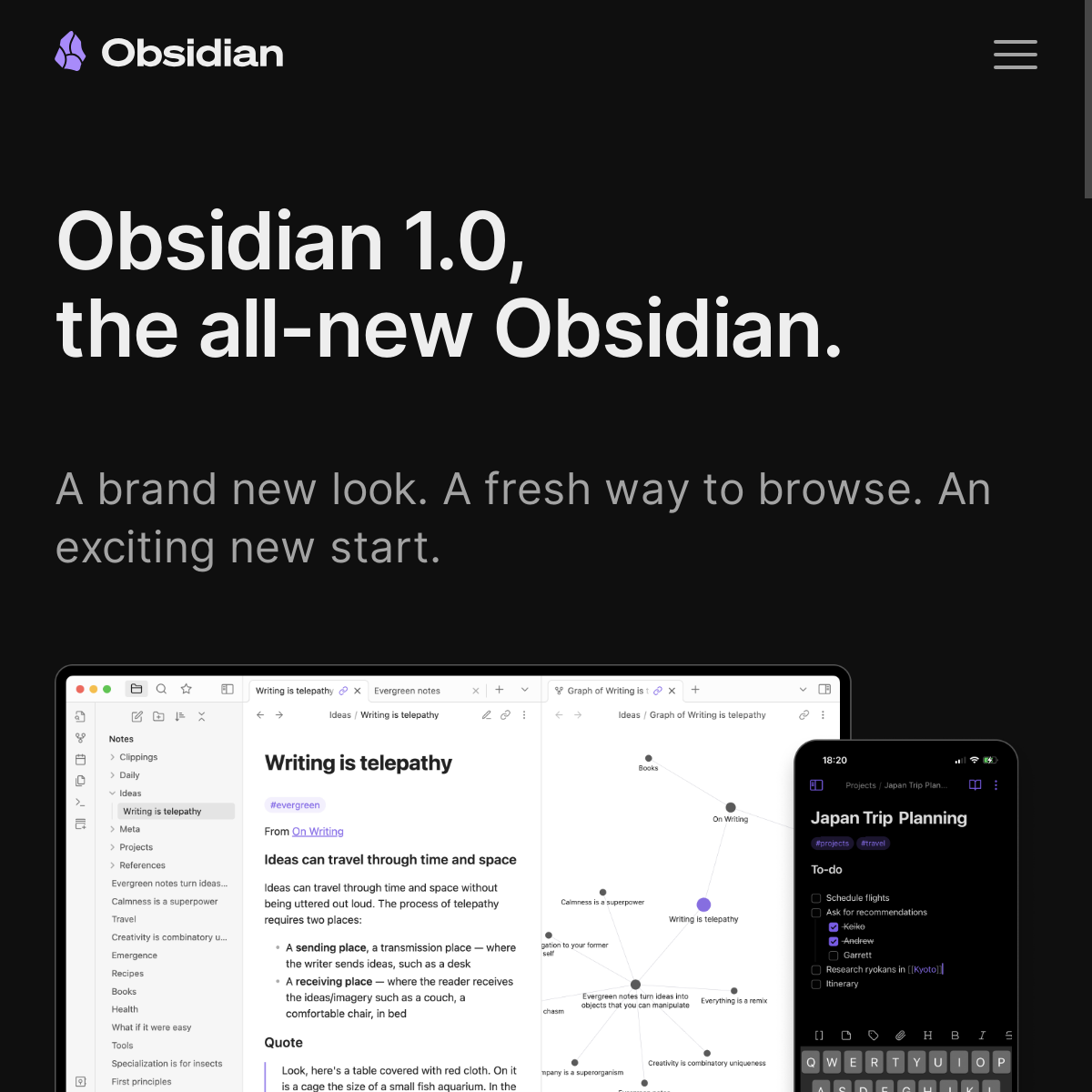 知识库软件 Obsidian 发布了 1.0 版本,在此之前它就已经拥有了众多的拥趸。本次发布的 1.0 版本,包含了全新的界⾯设计、更好的内容组织⽅式 等改进。同类笔记软件不少,⼤家也可以在评论区分享你最喜欢的。