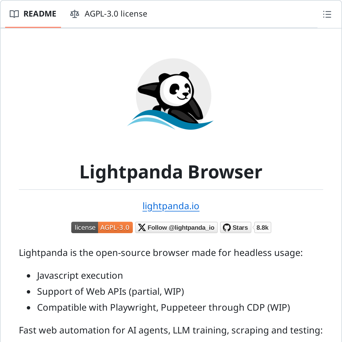 点评:Lightpanda 的目标是提供一个轻量级、高性能的无头浏览器解决方案,尤其适合需要大规模并行处理的场景。虽然目前还处于 Beta 阶段,但它已经展示了巨大的潜力,特别是在资源受限的环境中。专注 headless 场景也让它从设计之初就能保持轻量化。