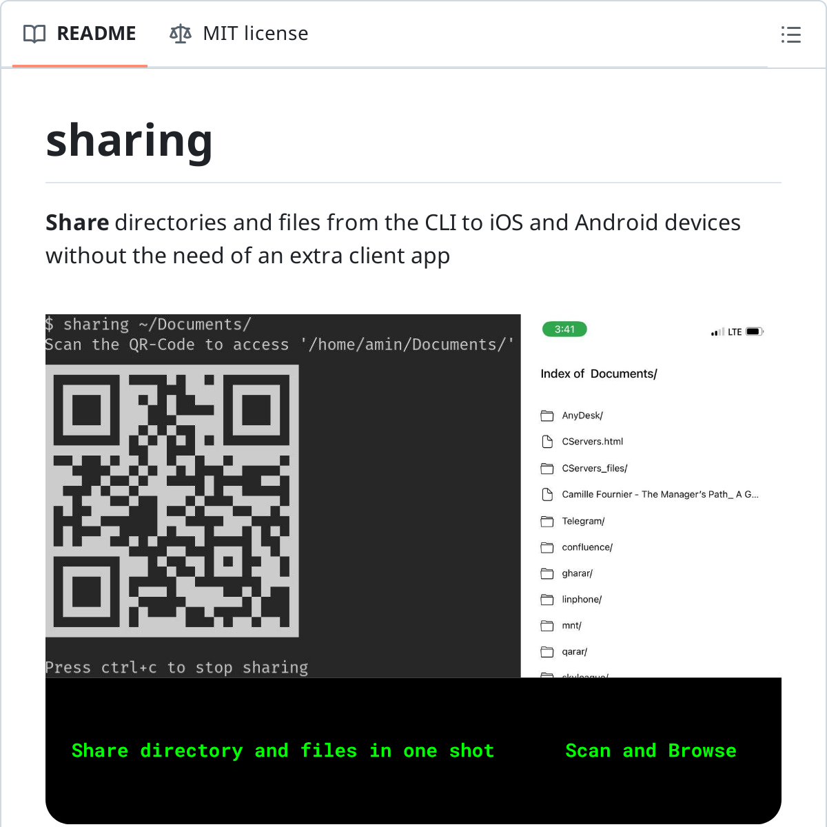 sharing 是一个帮助你完成这项工作的命令行工具,使用 sharing 可以将任意目录或文件以 URL 的形式对外暴露,同一个局域网环境中的手机通过扫描二维码就可以进行下载。如果所用的电脑有公网 IP,还可以将要分享的内容暴露在公网中。
