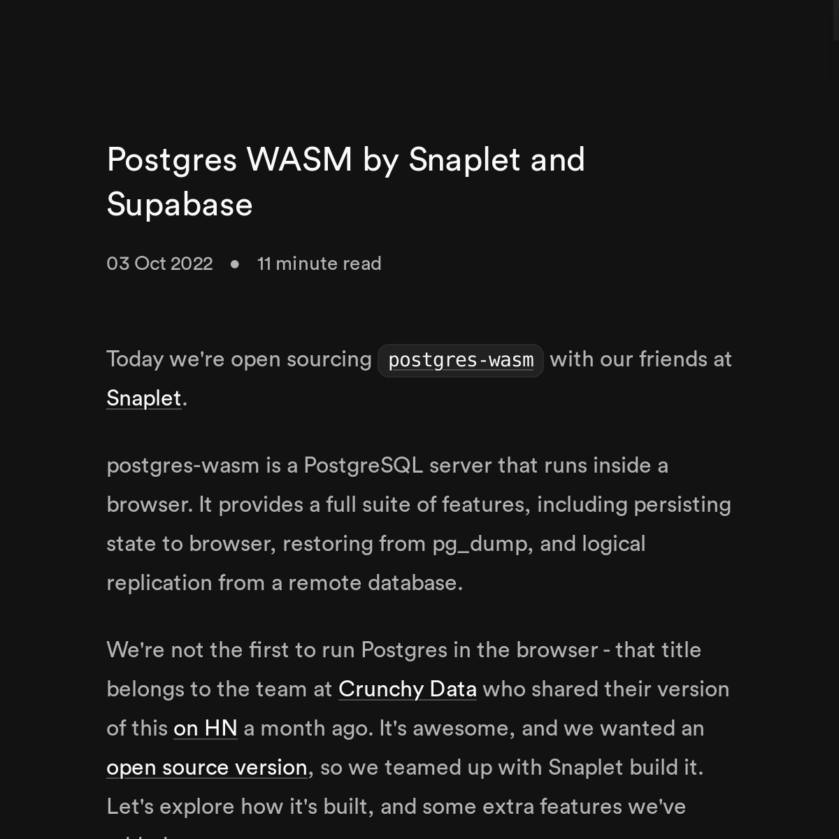 本周,Snaplet 与 Supabase 联合发布了实验性开源项目 Postgres WASM,通过WebAssembly 技术在浏览器中运行 PostgresSQL 数据库。之前我们介绍过 CrunchyData 发布的 Postgres Playground 项目,同样可以在浏览器中运行 PostgresSQL 数据库,但相关代码并未开源,而本次的 Postgres WASM 则是完整开源的版本,其中使用的虚拟化技术和网络技术以及 WebAssembly 的实践细节都可以在 Supabase 的博客中找到答案。