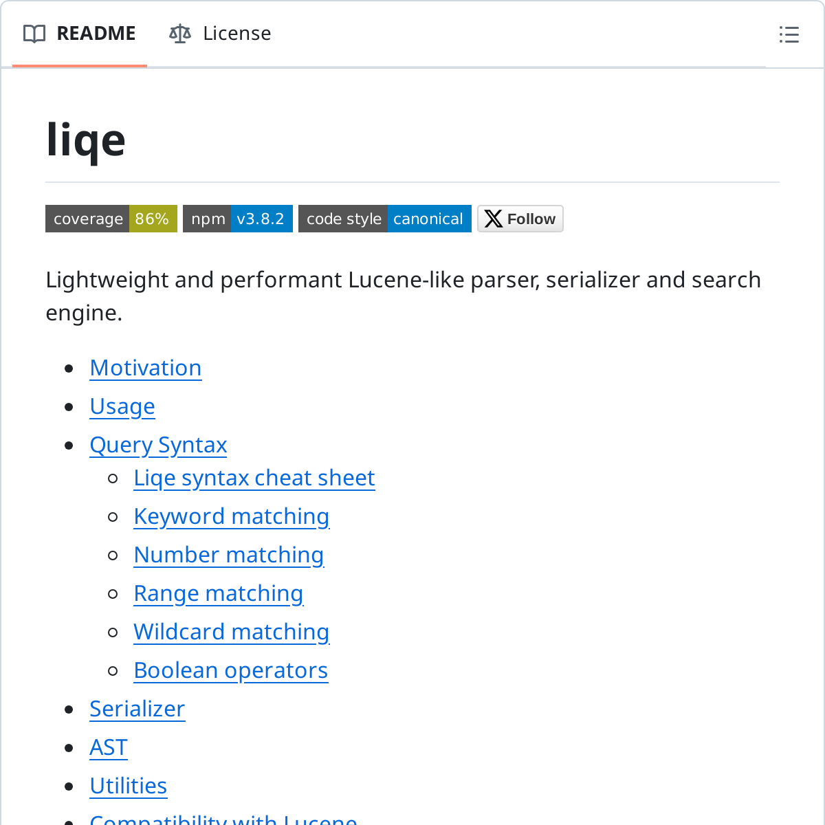 Liqe 是一个基于 Typescript 开发的轻量级搜索引擎,可以在 NodeJS 和浏览器中使用与 Lucene 相类似的语法搜索 JSON 数据。对于需要在客户端中搜索少量数据的场景比较实用。