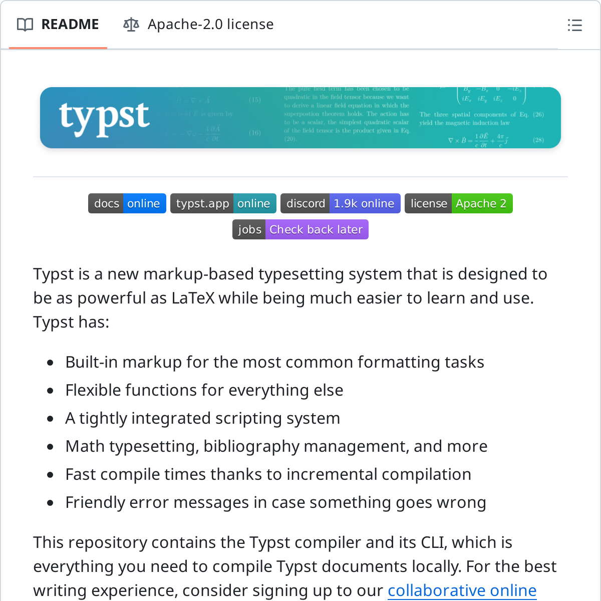 Typst 是一个近期开源的排版系统,其目标是保持简单易用的情况下提供与 LaTeX 同样强大的功能,避免用户再去学习复杂的 LaTeX 知识。对于各类学术写作场景,Typst 更加现代化,支持多人实时协同编辑、实时预览、模版等实用功能,一经开源也获得了大量的关注。