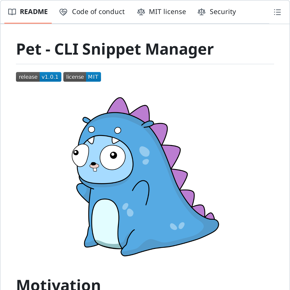pet 是一个命令行的代码片段管理工具。它可以帮助用户将一些不常用但是很有用的复杂命令保存下来,日后可以通过交互式搜索快速调用。pet 的优势在于它易于集成到已有的命令行工作流中,支持通过变量、标签进行代码片段的管理,并且可以方便地与云同步工具如 Gist 集成,实现团队协作。