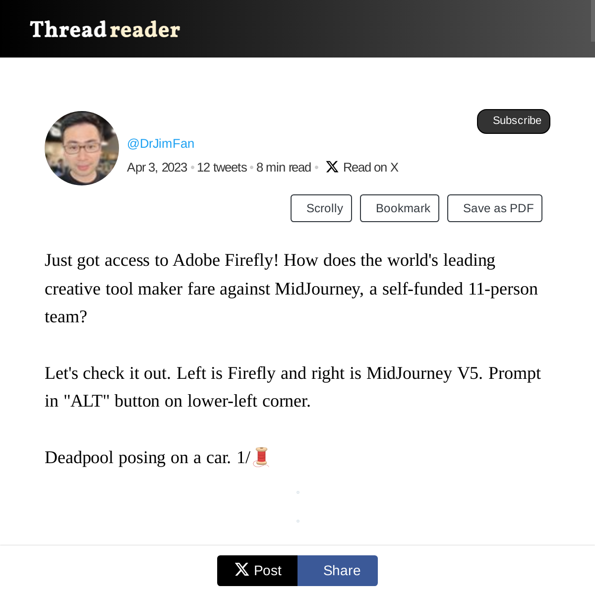 最后一则消息是对图像生成领域的两大产品 Midjourney 和 Adobe Firefly 的对比。在推文中,作者输入了多组提示语,并且对比了两款产品的生成结果。从结果上看,Midjourney 的生成结果非常贴合提示语,并且在细节上更加细腻。不过作者最后也提到,Adobe Firefly 的训练素材仅来源于 Adobe 拥有版权的图像,这一点对于对版权有严格要求的用户来说可能比图像的生成质量更加重要。