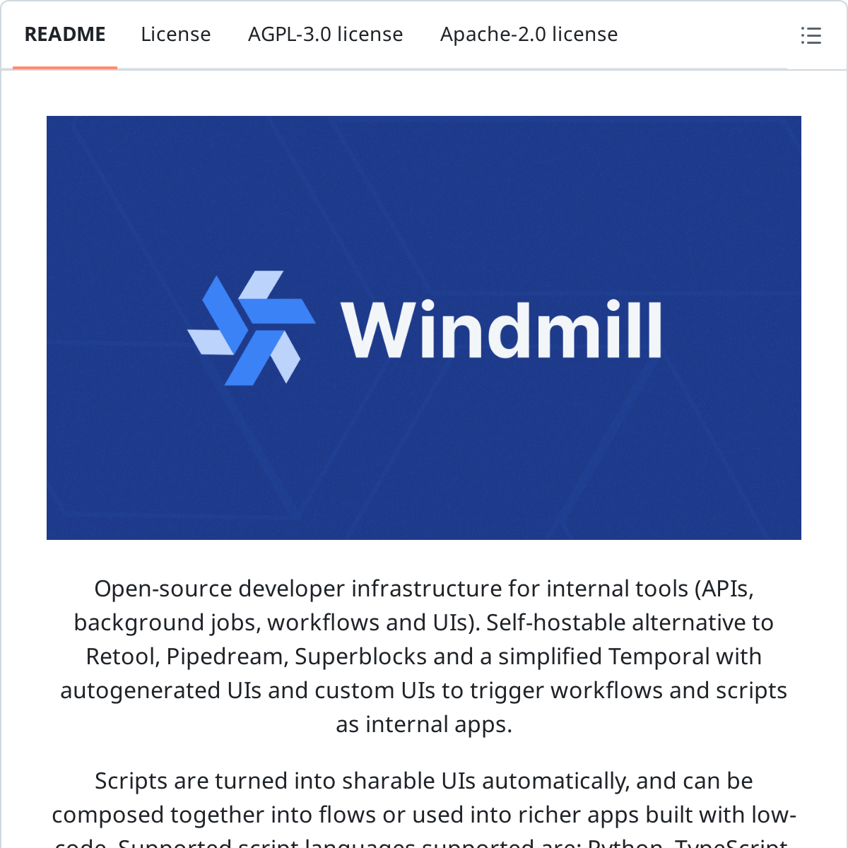 在低代码工具层出不穷的今天,还有什么样的产品可以令人眼前一亮?Windmill 这款工具的思路是由用户提供一段脚本,它通过分析脚本自动生成基础的 UI 用于调用该脚本,用户可以直接使用也可以基于低代码编辑器进行进一步的 UI 开发,最终获得一个可完整运行的前后端应用。目前该项目支持 Python、TypeScript、Go、Bash 和 SQL,通过脚本静态分析串联低代码 UI 和 serverless 应用是该项目的最大特色。