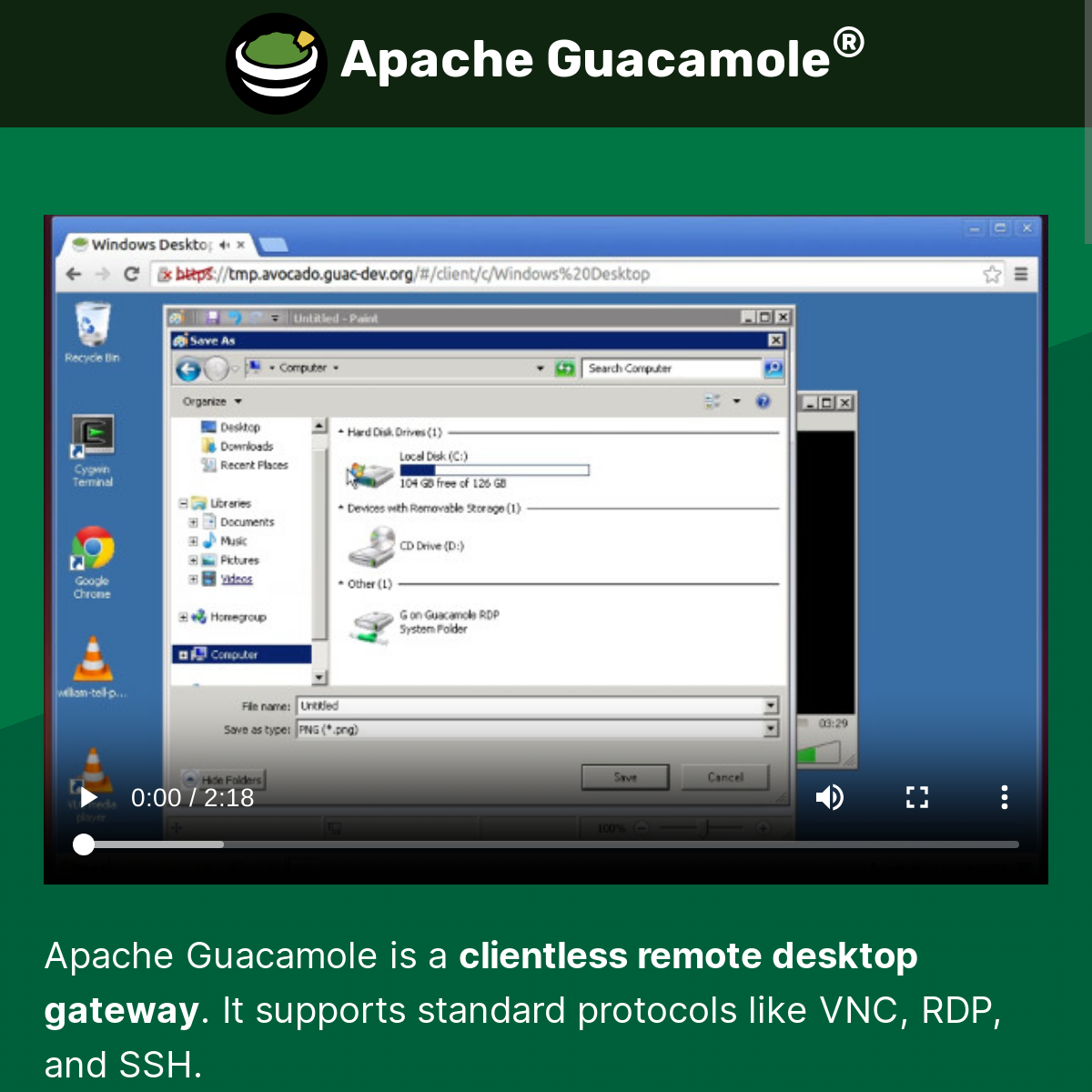Apache Guacamole 是⼀个⽆客户端的远程桌⾯⽹关。像常⻅的 VNC,RDP 和 SSH等协议,它都可以⽀持。 之所以被称为⽆客户端,是因为,它既不需要安装插件,也不需要安装 桌⾯客户端 软件。直接使⽤ Web 打开,它就可以⼯作。如果你过去是VNC,RDP 和 SSH 远程桌⾯的使⽤者,那你可以 考虑 尝试⼀下这款软件。