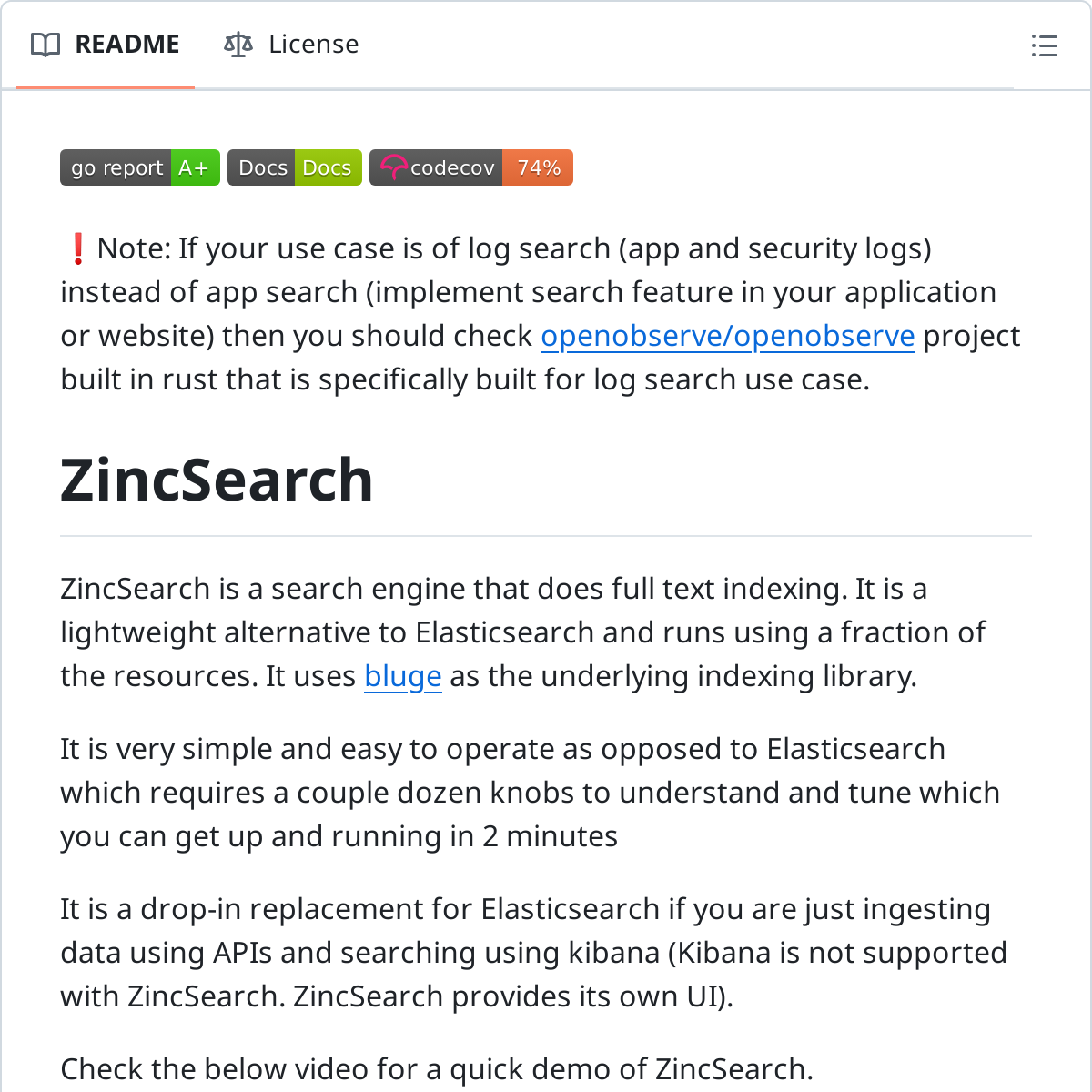 最后介绍的 ZincSearch 是 ElasticSearch 的轻量级替代品。作为搜索引擎的常⽤解决⽅案,ElasticSearch 也因为资源消耗⼤在⼀些资源敏感的场景下体验不佳。ZincSearch 团队希望基于 Go 重新开发全⽂搜索引擎,并且提供和 ElasticSearch 相近/1 2的 API 体验,同时减少资源的使⽤量,对于不想引⼊ ElasticSearch 场景的,不妨尝试⼀下。