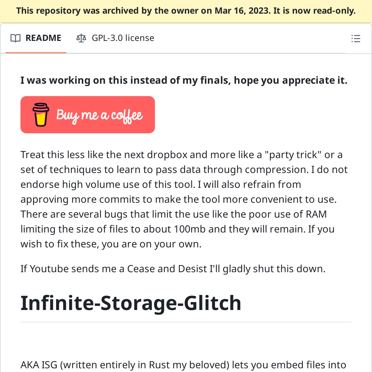 Infinite Storage Glitch 这个项⽬向⼤家展示了如何把 YouTube 作为⽹盘,保存任意⽂件。项⽬背后的原理⽐较简单,所有⽂件对应的字节都可以转换为⽤像素表示,再把所有的像素组合在⼀起以视频的格式保存下来。各⼤视频⽹站是否会对这种使⽤⽅式加以限制,⼤家可以持续关注。