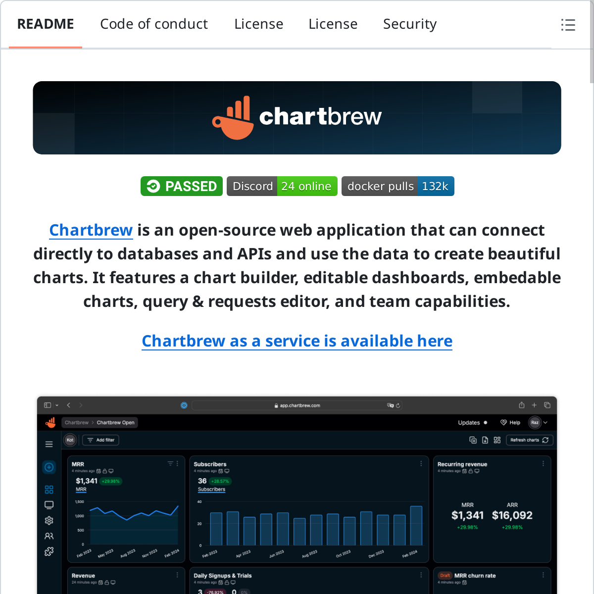 chartbrew 是⼀款开源的数据可视化 Web 应⽤,内置了多种数据库和云服务的集成,⽬标是让⽤户可以在⼀个统⼀的应⽤中查看所有的数据指标,也能够基于数据配置邮件和 Slack 等告警通知渠道。与同类⼯具相⽐,chartbrew 更加强调基于数据⾃定义报表并嵌⼊⾄其他应⽤进⾏分享的能⼒,同时对于⾃定义的报表可以充分定制样式,这让chartbrew 的应⽤场景⼗分丰富。