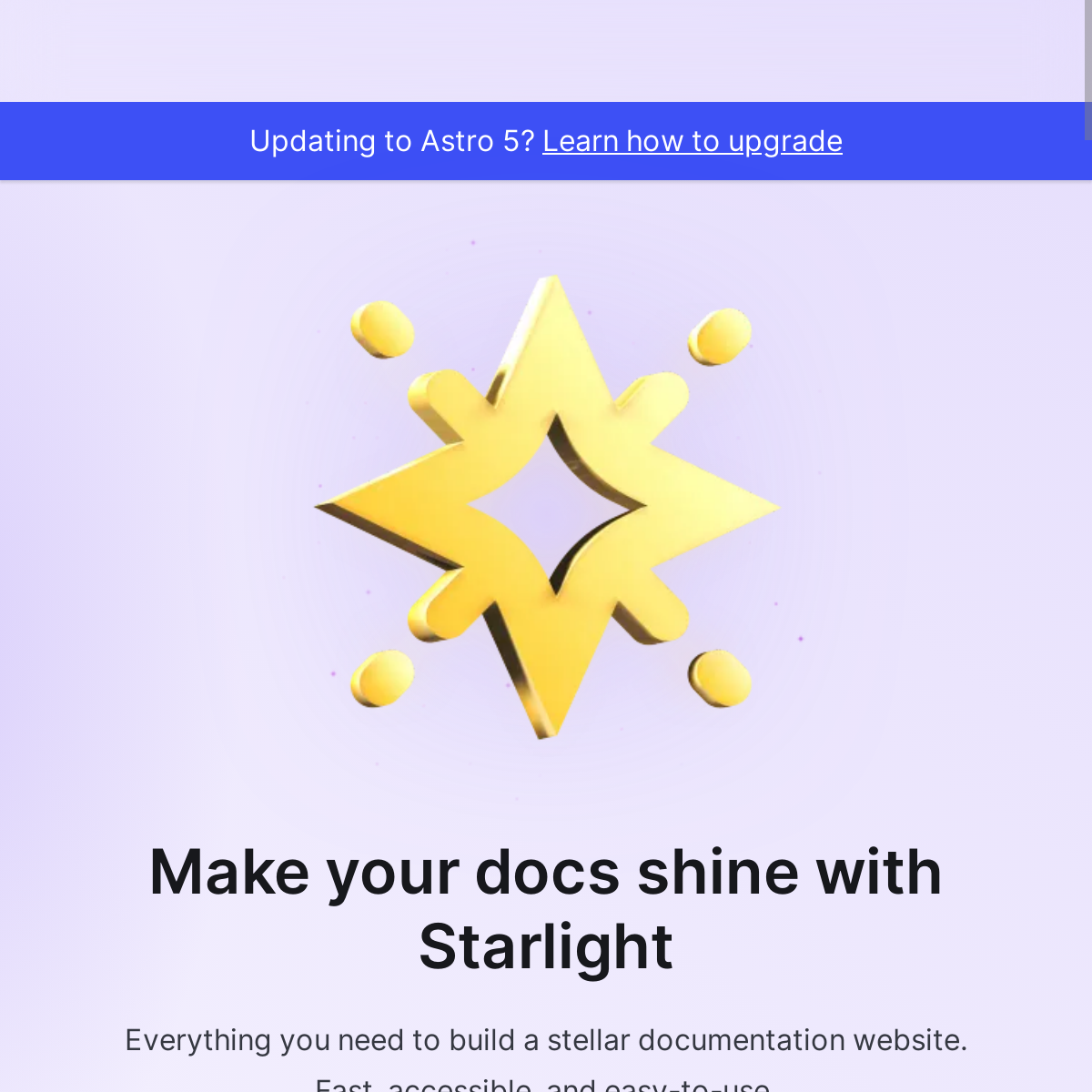 starlight 是前端框架 Astro 团队出品的⽂档⼯具,本身也为 Astro ⽂档等⼀系列站点提供服务。⽂档作为典型的静态⻚⾯场景,Astro 的性能优势可以得到最⼤程度的发挥。starlight 本身也提供了 Markdown、Markdoc、MDX 等多种⽂件格式的⽀持以及⾃定义组件的能⼒,让⽂档的可定制性⼤⼤提升。