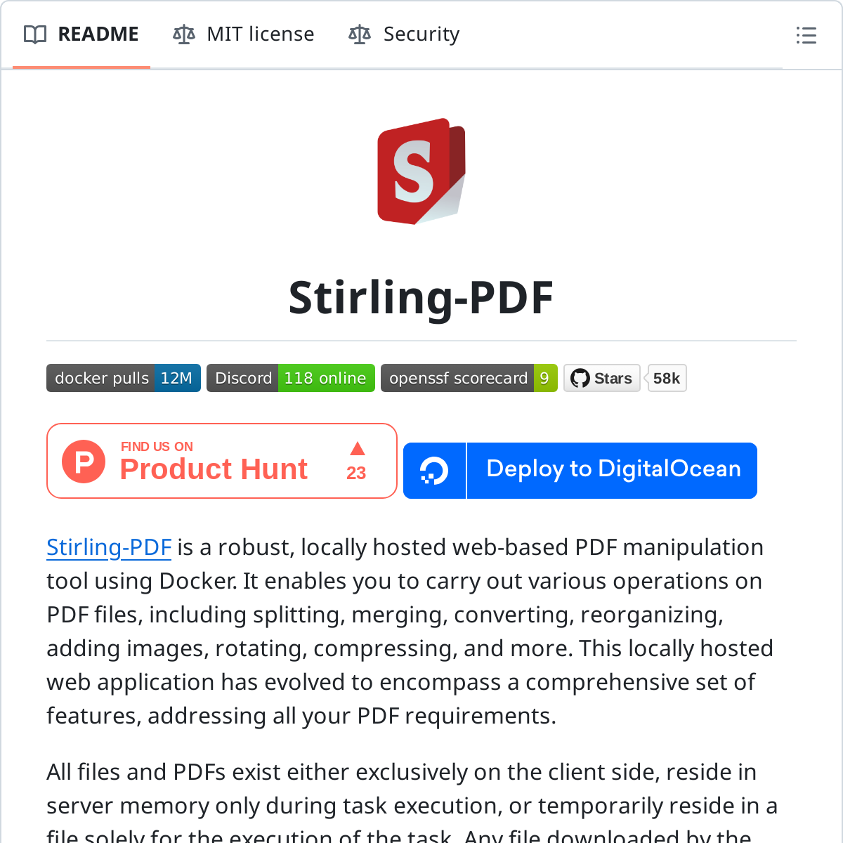 Stirling-PDF 是⼀个功能强⼤的⾃部署 PDF 处理⼯具。得益于完全本地化部署,该⼯具可以很好地保护隐私和数据安全。功能⽅⾯也⾮常丰富,包括 PDF 拆分、合并、转换、重组、添加图⽚、旋转、和压缩等多种操作。有 OCR 等⾼级需求的⽤户,也可以通过扩展插件完成集成。Koala 认为:在当下⼤语⾔模型引领的 AI 时代中,围绕⼤量现存 PDF ⽂本物料如何被有效使⽤也产⽣了很多⼯具链。Stirling-PDF 不仅能适⽤于AI 模型相关的使⽤需求,也可以满⾜传统 PDF 的编辑操作需求,是⼀个很全能的⼯具。