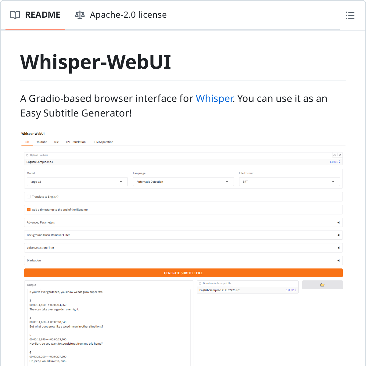 Whisper-WebUI 提供了⼀个基于 Gradio 的 UI,使得语⾳识别⽣成字幕轻⽽易举。⽤户可以选择不同的 Whisper 版本,并从⽂件、YouTube、⻨克⻛等来源⽣成字幕,⽀持 SRT、WebVTT、txt 等格式。此外,Whisper-WebUI 还⽀持语⾳到英⽂的⾃动翻译,结合 NLLB (No Language Left Behind)模型或 DeepL API 进⾏⽂本翻译,并通过多种前后处理功能增强字幕⽣成效果。通过 Docker 即可在本地快速部署体验。Koala 认为:Whisper-WebUI ⼤⼤简化了字幕⽣成的流程,是内容创作者和字幕⼯作者的利器,特别适合为视频内容提供多语⾔字幕的场景。