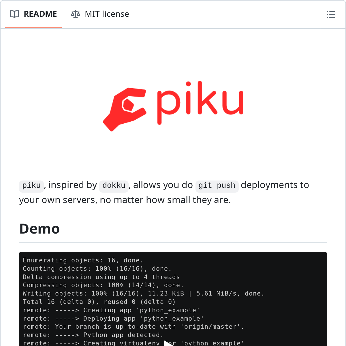 如果你在寻找⼀个轻量级的 PaaS 解决⽅案,Piku 可能会是你喜爱的项⽬。Piku 的作⽤是让⽤户通过 git push ⼀键将代码部署到服务器上。Piku 复⽤了 Git 的多版本代码管理能⼒,与此同时,当⽤户 push 代码时,Piku 会针对不同编程语⾔⾃动实现在部署服务器上安装依赖,例如对于 NodeJS 程序,Piku 会⾃动根据 package.json 的内容安装依赖。同时 Piku 还提供了单服务器部署多个应⽤、SSL 证书、缓存静态⽂件等常⻅需求。