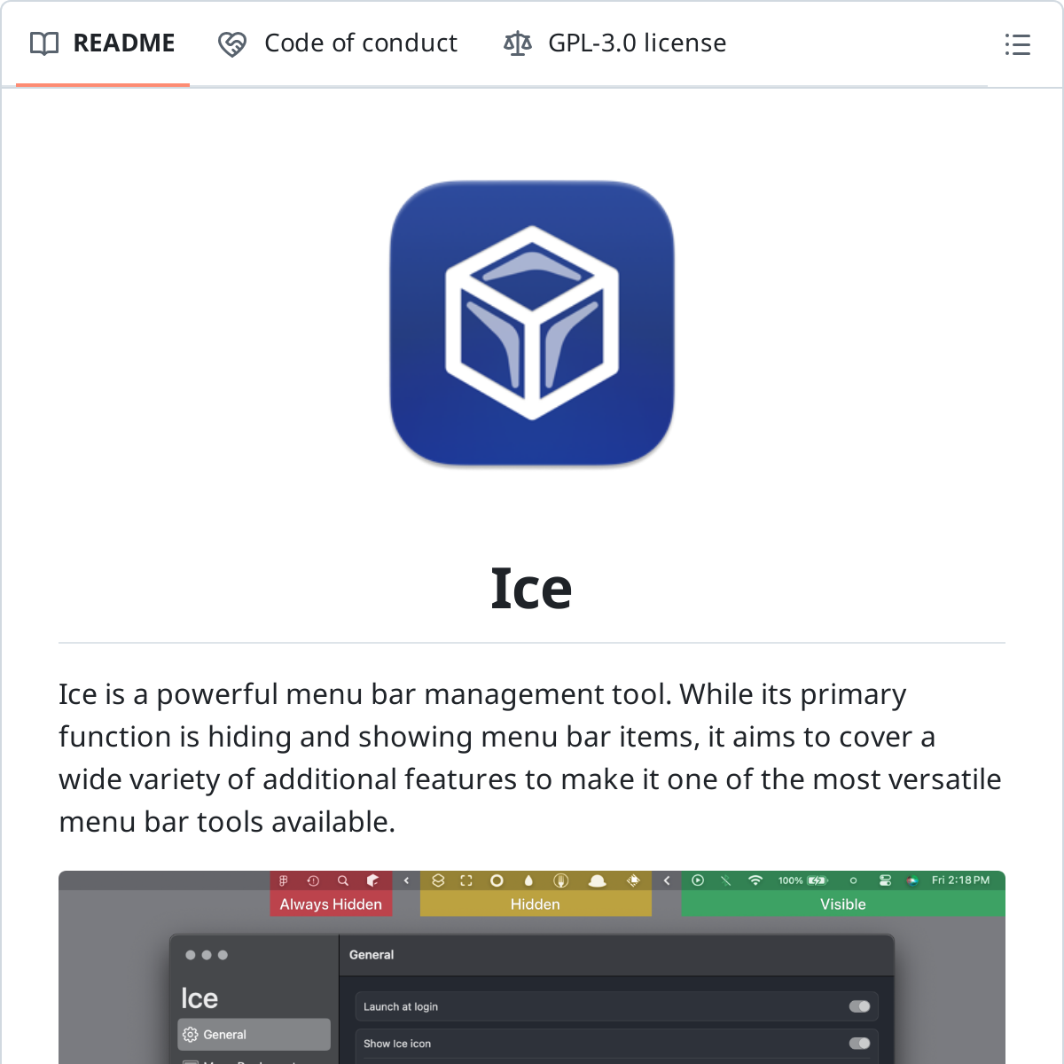 Ice 是⼀款强⼤的 macOS 菜单栏管理⼯具。它的主要功能是隐藏和显示菜单栏项⽬,但它不仅限于此,还涵盖了许多其他功能,例如配置菜单栏外观,设置快捷键,拖放排列菜单内容等。该⼯具可以⼿动下载安装或通过 brew 安装,需要注意的是, Ice 使⽤了⼀些系统 API,这些 API 仅在 macOS 14 及以上版本中可⽤。对于 Mac 重度⽤户来说,这个⼩⽽美的效率⼯具值得⼀试。