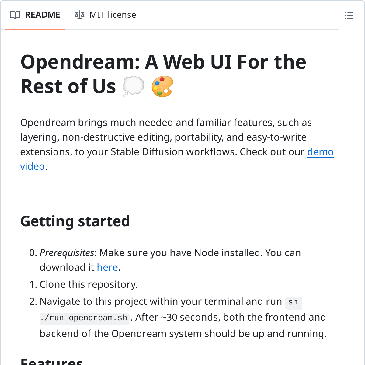 Opendream 是⼀个开源的、基于 Web 的 Diffusion 图像⽣成⼯具。与其他已有的Diffusion UI 项⽬相⽐,Opendream 实现了与 Photoshop 类似的图层功能,⽤户可以多次尝试⽣成新的内容,⽽不覆盖之前已完成的部分,这对于不易控制的 AI ⽣成流程来说可以显著提升效率。此外 Opendream 也提供了扩展机制,使其可以集成 DALL-E等其他模型。