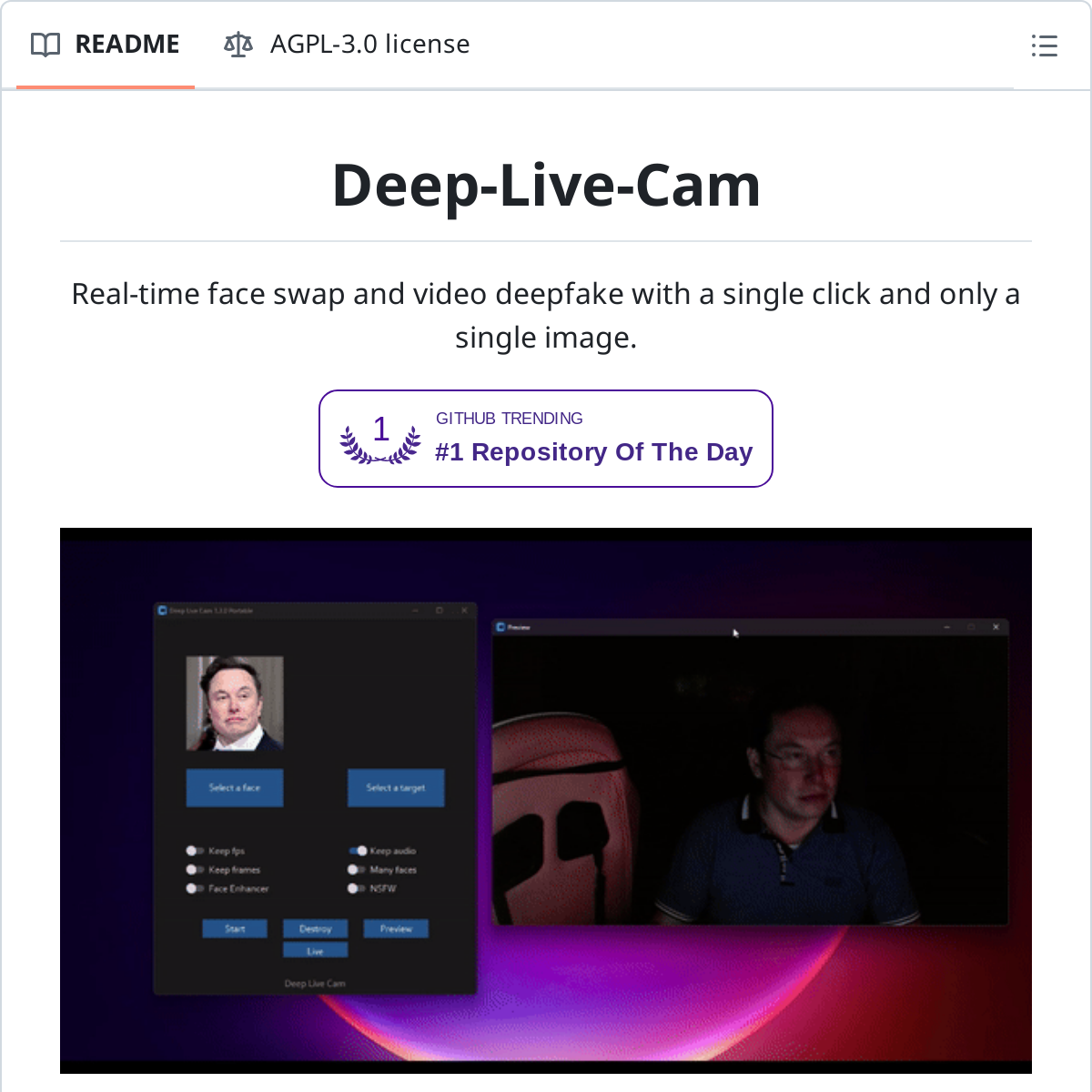 这个开源项⽬可以实现实时换脸和⼀键视频换脸,让⼈震撼的是它只需要⼀张⽬标⼈物的照⽚就能完成替换过程。开发者强调这个项⽬是为了帮助艺术家创作,⽐如给⾃定义⻆⾊添加动画等。不过他们也意识到可能存在的滥⽤⻛险,因此内置了检测机制来防⽌应⽤于不当内容,并要求⽤户使⽤时需遵守相关法律和伦理规范。