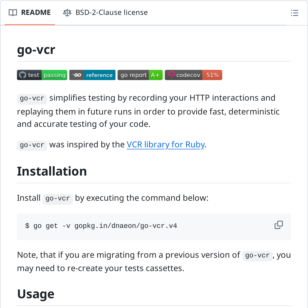在开发过程中,你是否遇到过需要反复测试 HTTP 请求的情况?go-vcr 就是为解决这个问题⽽⽣的。它可以帮助你录制 HTTP 交互,并在未来的测试中重放这些交互,从⽽/1 3实现快速、确定性和准确的测试。go-vcr 的核⼼思路是在第⼀次运⾏测试时,它会记录所有的 HTTP 交互并保存在⽂件中;之后的测试中,它会直接从⽂件记录中重放这些交互,⽽不是真正发送请求。从⽽使测试执⾏更快、更稳定、更可控。go-vcr 会创建⼀个包含 HTTP 的交互记录,它还⽀持⾃定义请求匹配、钩⼦函数等⾼级特性,可以满⾜各种复杂的测试需求。