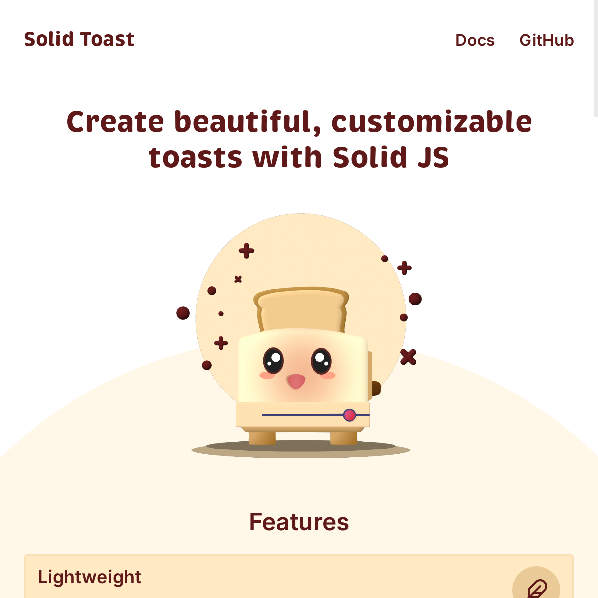 Solid Toast 是⼀个为 Solid JS 框架设计的轻量级、可定制的通知组件库。它的体积⾮常⼩巧,压缩后仅有 4KB ⼤⼩,这使得它可以轻松集成到各种项⽬中⽽不会显著增加应⽤的体积。这个库提供了美观的默认样式,包括成功、错误、加载中等不同类型的通知样式。同时,它还⽀持⾼度的⾃定义性,允许⽤户使⽤⾃定义的 JSX、图标、样式属性和颜⾊等个性化通知的内容和外观。
