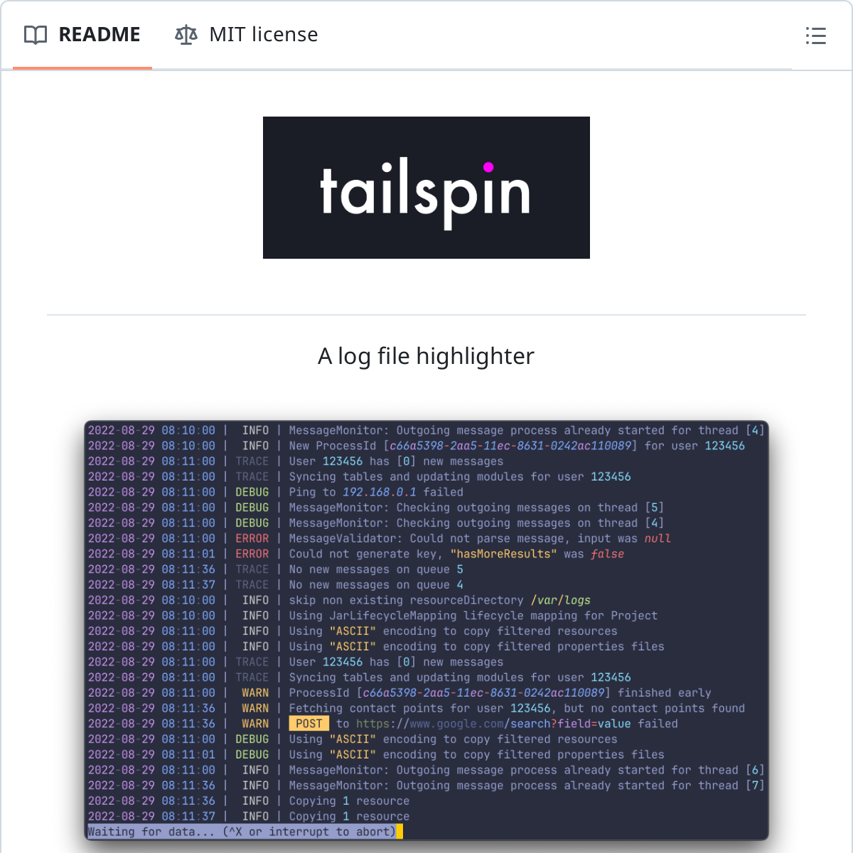 tailspin 是⼀个基于 Rust 开发的⽇志查看⼯具,以 CLI 的形式⼯作。与常规的⽇志查看指令相⽐,tailspin ⽀持监控整个⽇志⽂件夹、⾃动⾼亮时间、数字、IP、UUID等内容,以及灵活的搜索过滤能⼒。它也可以和其他命令管道组合使⽤,例如结合 kubectllogs 提取 K8s 中的 Pod ⽇志。