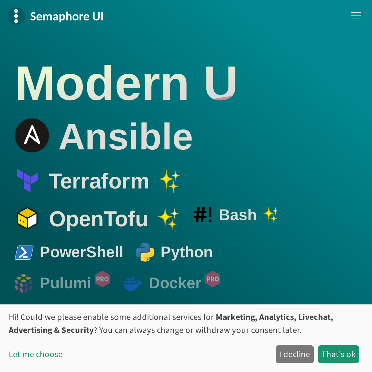 Semaphore UI 是一款为 Ansible、Terraform、OpenTofu 等 DevOps 工具打造的现代化 UI。它提供了一个直观的 Web 界面,让你轻松管理和执行自动化任务。你可以通过它来运行 Ansible Playbook、Terraform 代码和 Bash 脚本。Semaphore 自身的安装非常简单,几分钟就能搞定。除了 UI 之外,它还提供了完整的 API,方便开发者进行二次开发和集成。